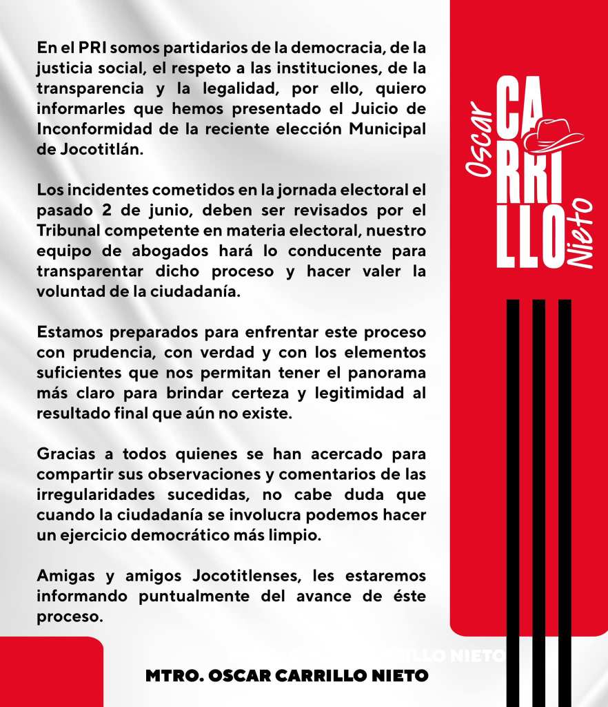 Jocotitlán, Méx., junio de 2024.- Óscar Carrillo Nieto, ex candidato a la Presidencia Municipal de esta demarcación, por el Partido Revolucionario Institucional (PRI), presentó ante el Tribunal Electoral del Estado de México (TEEM), el Juicio de Inconformidad de la elección Municipal de Jocotitlán, argumentando que, en su partido, el PRI, son partidarios de la democracia, de la justicia social y de la legalidad.