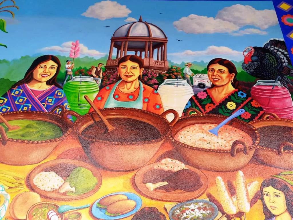 En un trabajo que llevó tres meses y medio de labor, se plasmó el mole de guajolote rojo y verde que se degusta en las comunidades de San Pablo Atotonilco y San Ignacio de Loyola. No podían faltar los tamales rojos, verdes, de dulce, rajas, oaxaqueños y las famosas “guajolotas”, acompañados de un rico atole o café de olla, sin dejar de lado las “conchas” con nata; nada mejor para empezar el día en el Jardín “Hidalgo”. También se pueden admirar los antojitos mexicanos, tales como tacos dorados o “flautas”, pambazos de cabeza, tlacoyos, sopes y gorditas.