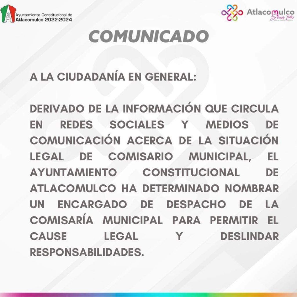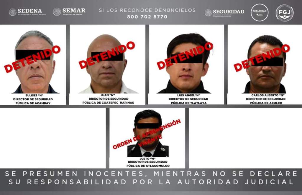 La Fiscalía también logró establecer la probable intervención de Justo “N”, Director de Seguridad Pública del municipio de Atlacomulco, en actividades de extorsión a nombre del mismo grupo criminal. Este sujeto cuenta con orden de aprehensión vigente; la SEDENA, SEMAR, SSPC, SSEM y Fiscalía Edoméx trabajan para dar cumplimiento a dicho mandato.