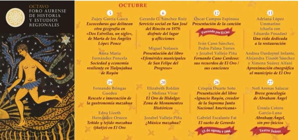 Es estos días lluviosos, en los que una espesa melancolía parece apoderarse en ocasiones del ambiente, se está llevando a cabo un proyecto formidable que lleva por nombre Foro Aurense de Historia y Estudios Regionales cuya misión principal es, desde 2014 y como su nombre lo indica, convocar al estudio regional del antiguo distrito minero de El Oro y Tlalpujahua y sobre todo compartir generosa y desinteresadamente el producto de dichos estudios.