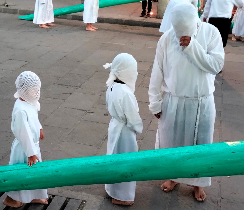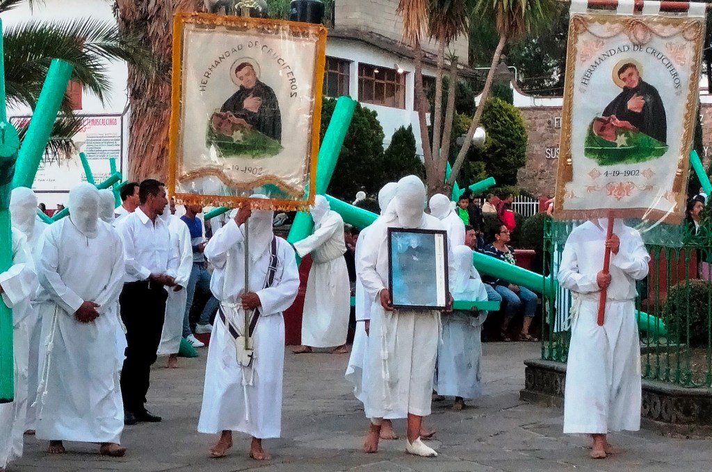 Es así, que al menos 150 a 350 crucíferos vestidos con túnicas blancas, cubiertos sus rostros con paños blancos, y descalzos parten de la iglesia de San Miguel Arcángel cargando cruces que van de los 120 hasta los 200 kilogramos, y de esa manera, sentir el sacrificio que hizo el Señor Jesucristo para el perdón de los pecados.