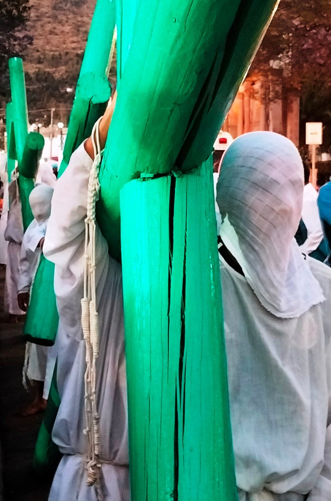 –Si estoy aquí es por mis tíos. Ellos venían y pues yo los seguía. Ahora cargo una cruz como de cien kilos. Y hay cruces más pesadas, aunque todo depende de cómo te formes, porque los que van hasta adelante son los que cargan más peso. Aunque esto también tiene mucho que ver con los pecados, porque hay cruces que parecen ligeras, pero según las culpas que tengas, así pesa la cruz. Todo depende de la devoción y fe que tengas. Yo estoy aquí por una manda que hice.