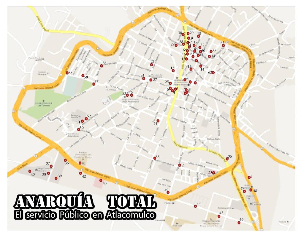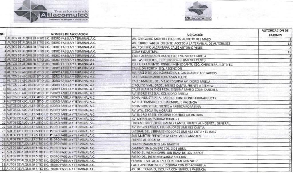 Bases OFICIALES ubicadas en la cabecera municipal y alrededores de acuerdo a información oficial proporcionada por medio de SAIMEX a través de la solicitud con número de Folio 00294/ATLACOM/IP/2025 de fecha 08 de abril de 2025, en donde se enumeran 59 bases con 295 cajones autorizados: