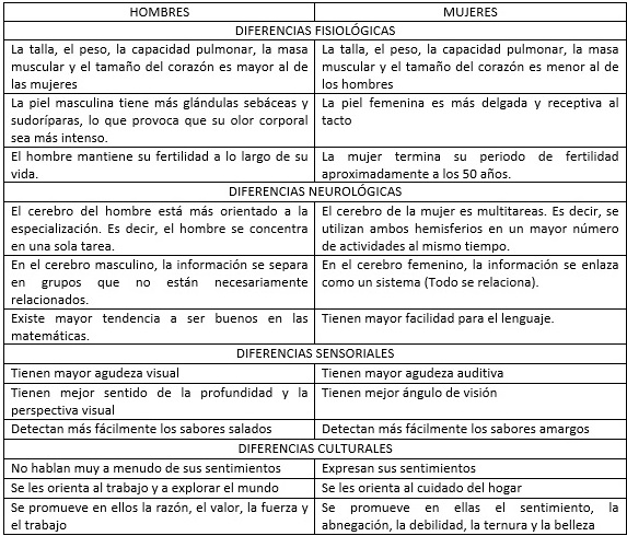 Hasta aquí queda claro, existen diferencias entre hombres y mujeres; diferencias que tienen que ver con lo biológico y con lo social. De manera general, vamos a apreciarlo en el siguiente cuadro: