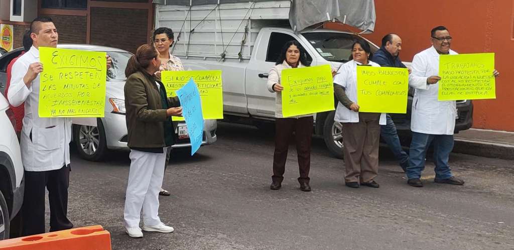 Personal del ISEM Centro de Atención Estomatológica Atlacomulco, se manifiestan pacificamente sobre la calle Juan de Dios Peza, a las afueras de sus instalciones.