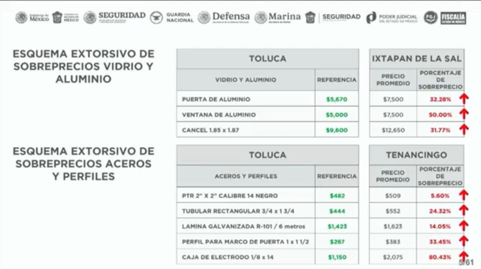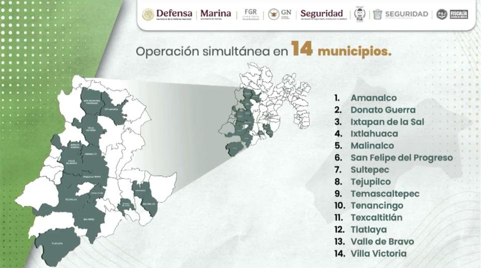 El secretario García Harfuch señaló que, mediante esta operación encabezada por la Fiscalía General de Justicia del Estado de México (FGJEM), en estrecha coordinación con la Secretaría de la Defensa Nacional (Defensa), Secretaría de Marina (Marina), Secretaría de Seguridad y Protección Ciudadana (SSPC), Guardia Nacional (GN) y el Centro Nacional de Inteligencia (CNI), se ejecutaron cateos en 52 establecimientos, donde se aseguraron animales de granja, cárnicos, materiales de construcción, además se intervinieron oficinas sindicales, de distribución de paquetería, minas, carnicerías, así como inmuebles destinados a la venta de alimentos para animales y forrajes que eran objeto de este delito.