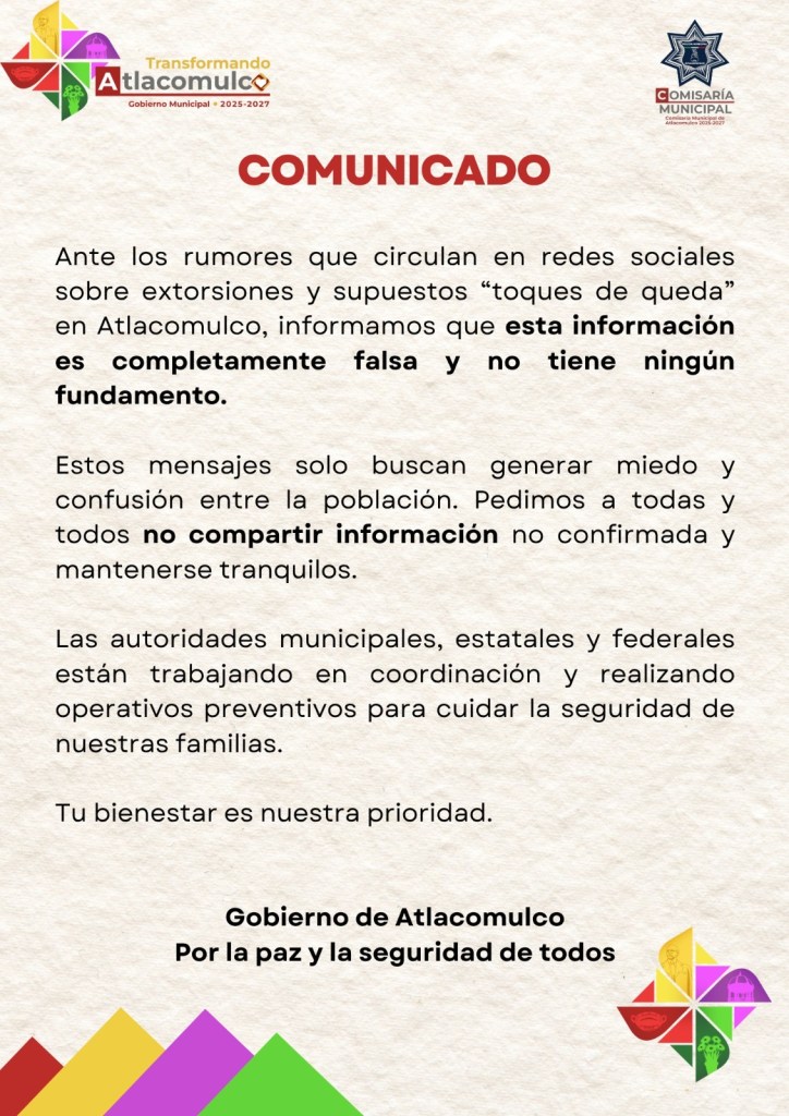 Retomamos el comunicado que el Ayuntamiento de Atlacomulco publicó al día siguiente de estos hechos, en el que se aseguraba que en redes sociales se manejaba información sobre extorsiones y toques de queda, lo cual, aseveraron, era falso, por lo cual llamaron a mantenerse tranquilos.