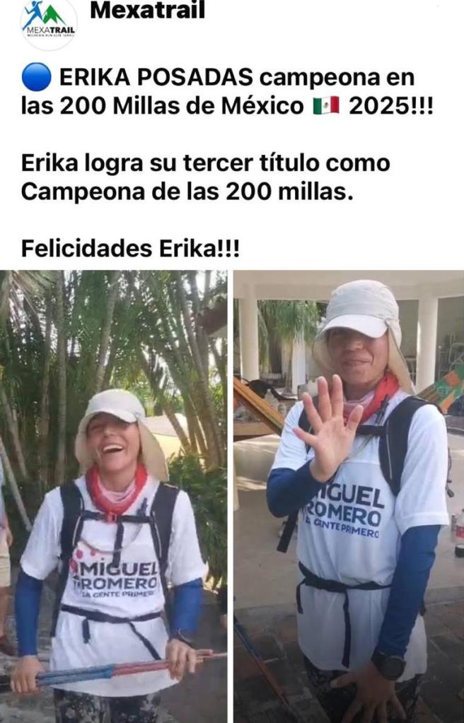 La ultramaratonista Erika Posadas, originaria de Atlacomulco, Estado de México, se consagró bicampeona de las 200 millas (320 kilómetros) del exigente Ultratrail “Tras las huellas del Jaguar”, al completar el recorrido en 83 horas, consolidándose como la única mujer en el país que ha conquistado esta prueba en tres ocasiones.