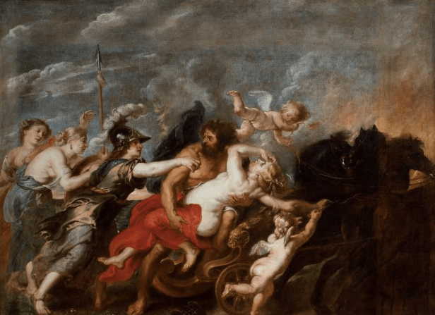 Cuando intentó recogerla, la tierra se abrió con un estruendo feroz y Hades emergió, sombrío y temible, en un carro tirado por caballos negros para llevarse a Perséfone al inframundo –lugar donde se asentaba su reino -pues desde hace tiempo la observaba, admirando su perturbadora hermosura y anhelando su compañía y afectos.