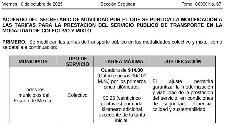 A partir del miércoles 15 de octubre habrá un ajuste de 17% a la tarifa de transporte público en el Estado de México, es decir, la mínima de 12 pasará a 14 pesos por los primeros cinco kilómetros; así se dio a conocer por parte de la Secretaría de Movilidad a través de un acuerdo publicado, como ya se mencionó, en la Gaceta del Gobierno.
