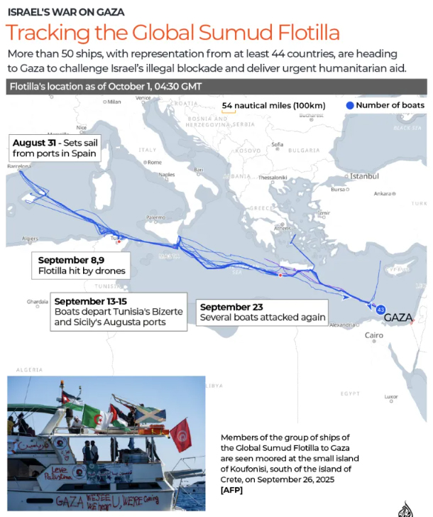 La Flotilla Sumud partió de Barcelona el 31 de agosto, con alrededor de 30 embarcaciones, a las que se fueron sumando otras a lo largo de su recorrido, para un estimado de 50 barcos y unas 530 personas de al menos 44 nacionalidades, sin que los datos puedan precisarse, y su recorrido terminó el 2 de octubre, cuando fue interceptada por fuerzas armadas israelíes, quienes abordaron las embarcaciones y detuvieron a todos los tripulantes. Indudablemente, la integrante más destacada de la flotilla fue la activista sueca Greta Thunberg, quien desde hace varios años enarbola causas ecológicas y humanitarias.