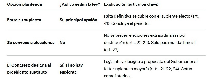 - No se convoca a elecciones extraordinarias: La ley no prevé elecciones en estos casos (artículos 22, 24 y 41). Solo se convocan si no se verifican o declaran nulas las elecciones originales (artículo 23), lo cual no aplica a una destitución durante el periodo.