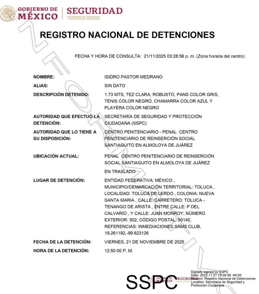El Registro Nacional de Detenciones confirma que la captura ocurrió a las 12:50 horas en la colonia Nueva Santa María del municipio de Toluca, en las inmediaciones de un centro comercial ubicado sobre la carretera Toluca–Tenango.