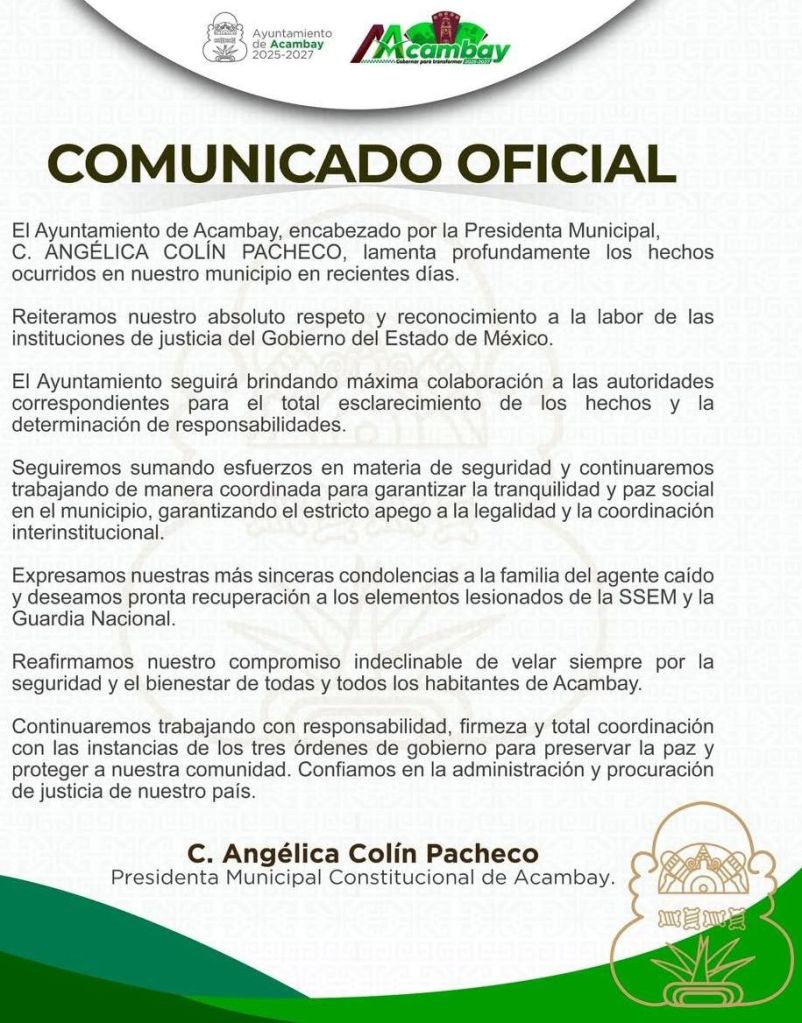 Mediante un “comunicado oficial” el ayuntamiento de Acambay encabezado por la C. Angélica Colín Pacheco, se dignó dar a conocer la posición sobre los hechos ocurridos en este municipio la madrugada del pasado domingo 23 de noviembre, donde hubo un enfrentamiento entre policías municipales y elementos de la Policía Estatal y Guardia Nacional, que derivo en el arresto de doce municipales incluido el mismísimo Comisario, https://revistadinteres.com.mx/2025/11/23/acaban-de-sentenciar-al-ex-director-de-seguridad-de-acambay-eulises-gonzalez-hernandez-y-su-nuevo-director-ya-tambien-fue-detenido/ ).