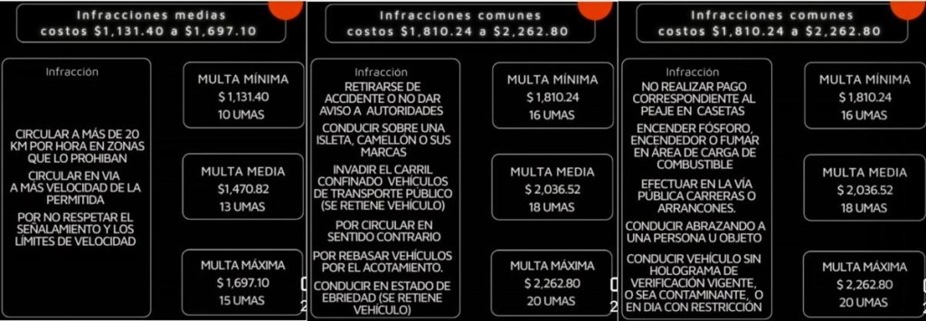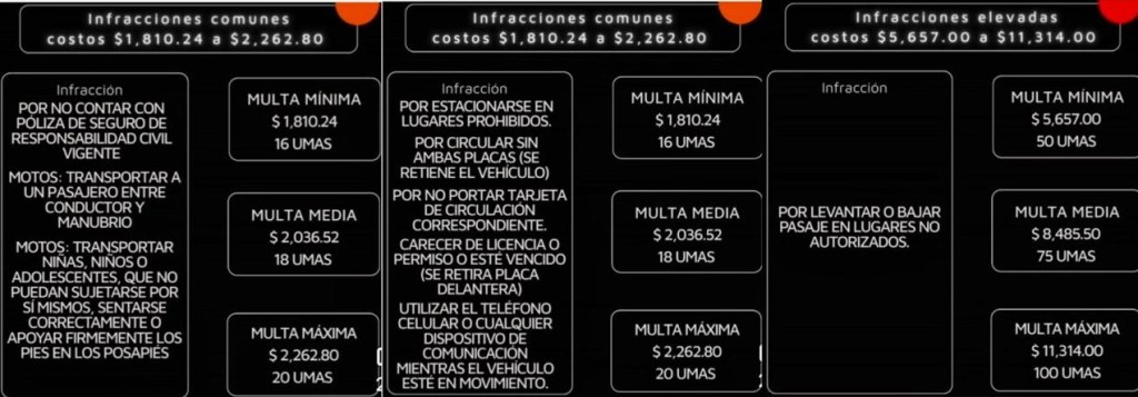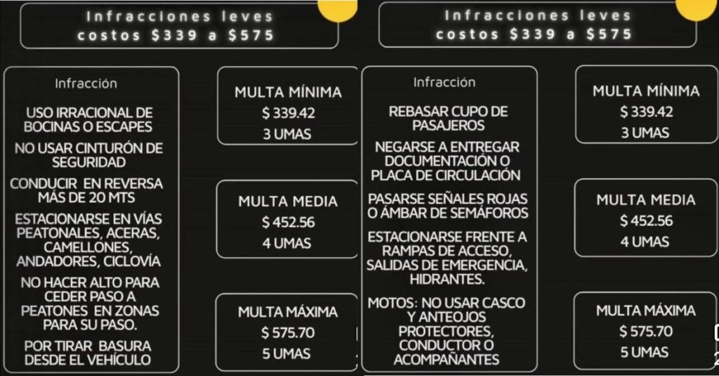 También se sancionará con multas de 16 a 20 UMAS, es decir de mil 810 a dos mil 262 pesos a quienes participen en arrancones, conduzcan sin licencia, obstruyan rampas peatonales, circulen sin placas o usen el celular mientras manejan.