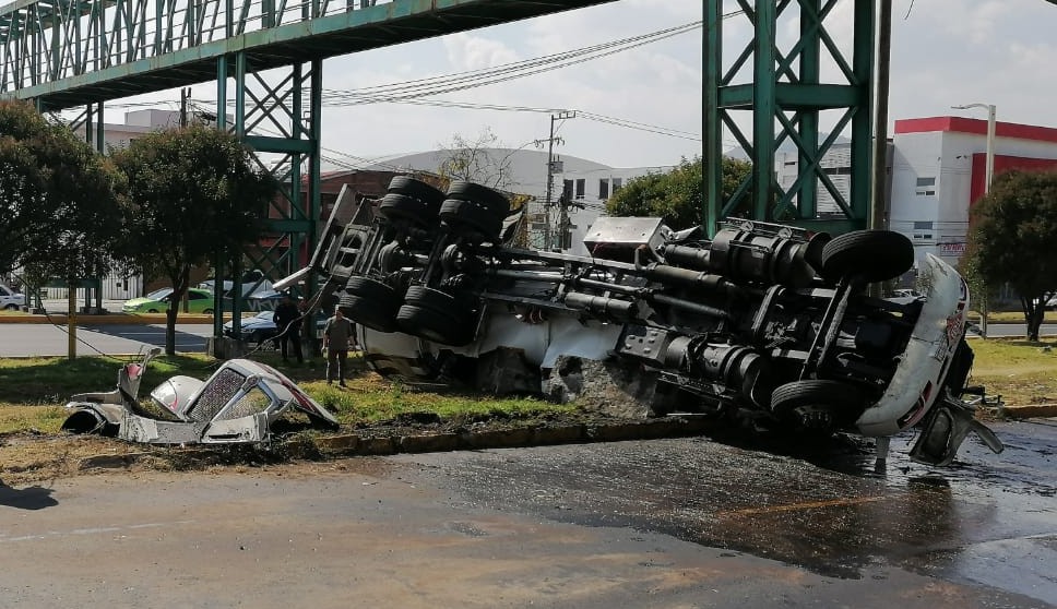Testigos aseguran que oyeron un "estruendo" cuando la pipa derrapó y chocó contra la base del puente peatonal que conecta la URIS con el COBAEM y la Central de Abastos.