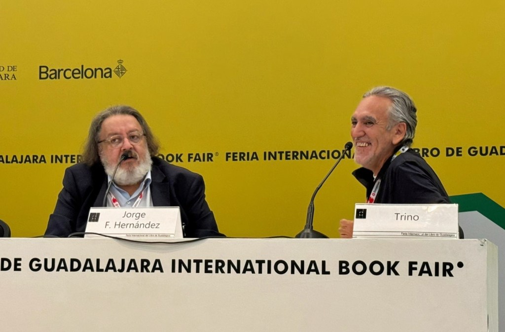 Valiéndome de un gafete prestado que me acreditaba como miembro del pabellón de Barcelona y haciendo uso de alguna de las argucias que he ido aprendiendo en estos 65 años de vida, conseguí que me abrieran paso y que una guardia de seguridad me acompañara hasta el auditorio 6, al que entré con 20 minutos de retraso, para encontrarme un público de menos de 15 personas, ante quienes Trino y Hernández (Guerrero no asistió), platicaban en petit comité.