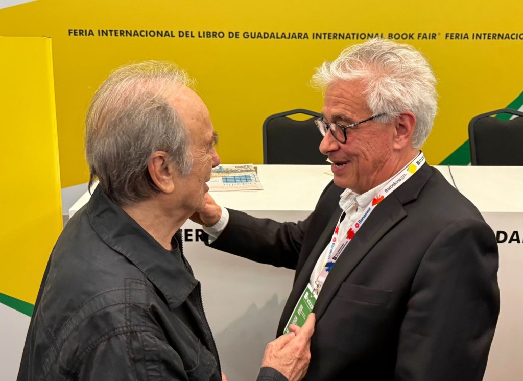 Ciertamente me preocupaba no poder entrar a “Mil jóvenes con Serrat” —programado para las 4 PM del jueves 4 de diciembre—, puesto que, al menos cronológicamente, estoy lejos de ser joven, además de que en el programa se especificaba claramente “se requiere invitación”. El primer escollo era insalvable, pero para el segundo yo tenía un arma secreta: mi amigo Alejandro Escalante, propietario de la empresa que produjo el pabellón de Barcelona en la FIL, a quien me referí en el artículo pasado. Así que a mi tocayo acudí en busca de una solución que él encontró, no sin cierta dificultad: obtuvo, de otro contacto dentro de la organización de la feria, unos brazaletes de invitado, con los que pudimos franquear el ingreso y meternos hasta las primeras filas del abarrotado auditorio Juan Rulfo, que los organizadores debieron ampliar a última hora, recorriendo las mamparas posteriores, para aumentar el aforo y permitir el ingreso de algunas personas del “público en general”.