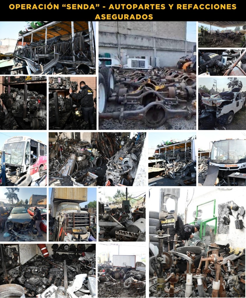 Otros inmuebles asegurados fueron deshuesaderos, en los que se localizaron chasises de tractocamiones, motores y diversas refacciones con medios de identificación alterados o reporte de robo, además de pensiones o “encierros” utilizados para el ocultamiento y desvalijamiento de unidades robadas, así como el traspaleo de la mercancía.