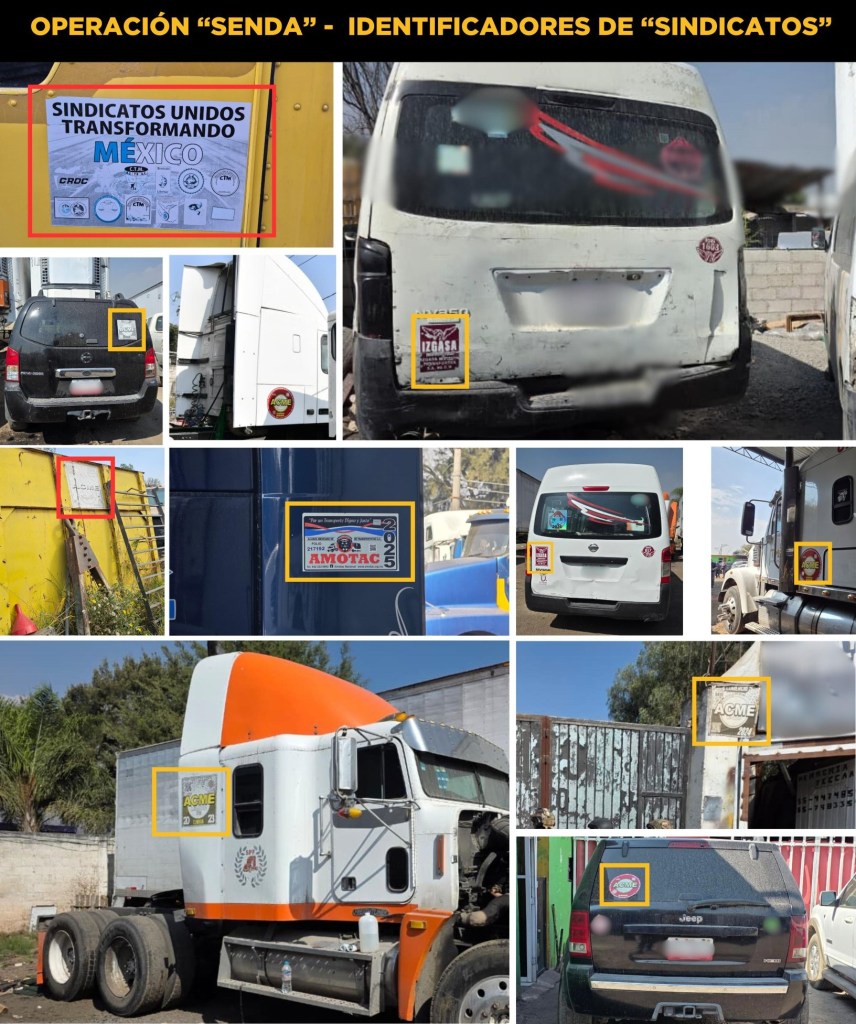 Adicionalmente fueron asegurados 178 vehículos, algunos de ellos con medios de identificación alterados e incluso con calcomanías o rótulos de organizaciones sociales con apariencia de sindicato o asociación, en particular los autodenominados “ACME”, “USON”, “IZGASA”, “AMOTAC” y “Sindicatos Unidos Transformando México”, unidades presuntamente utilizadas para el “traspaleo” y traslado de cargamentos robados.