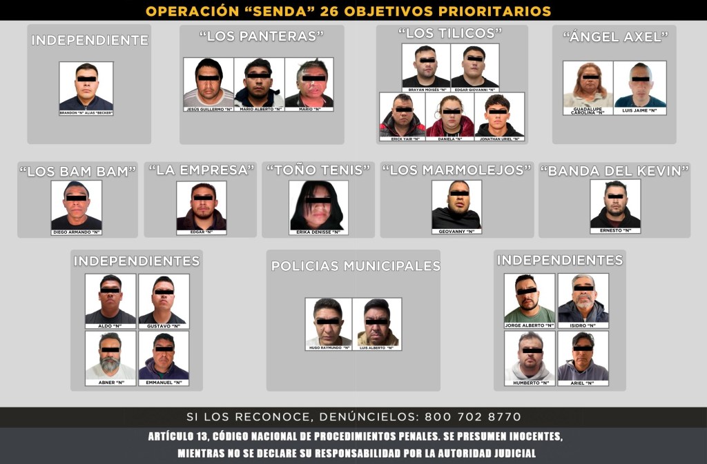 De igual forma fueron detenidos Erik Yair “N”, Daniela “N”, Brayan Moisés “N”, Edgar Giovanni “N” y Jonathan Uriel “N” del grupo delictivo autodenominado “Los Tilicos”; Jesús Guillermo “N” y Mario Alberto “N”, principales integrantes de “Los Pantera”; Guadalupe Carolina “N” y Luis Jaime “N” de “Ángel Axel”; Ernesto “N” de la “Banda del Kevin”; Diego Armando “N” de los “Bam Bam”; Edgar “N” de “La Empresa”; Geovanny “N” de “Los Marmolejo”; Erika Denisse “N” de “Toño Tenis”; así como Hugo Raymundo “N” y Luis Alberto “N”, quienes hasta el momento de su detención fungían como elementos de una corporación de policía municipal.
