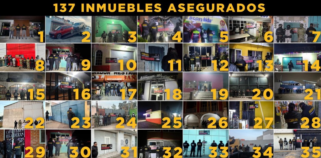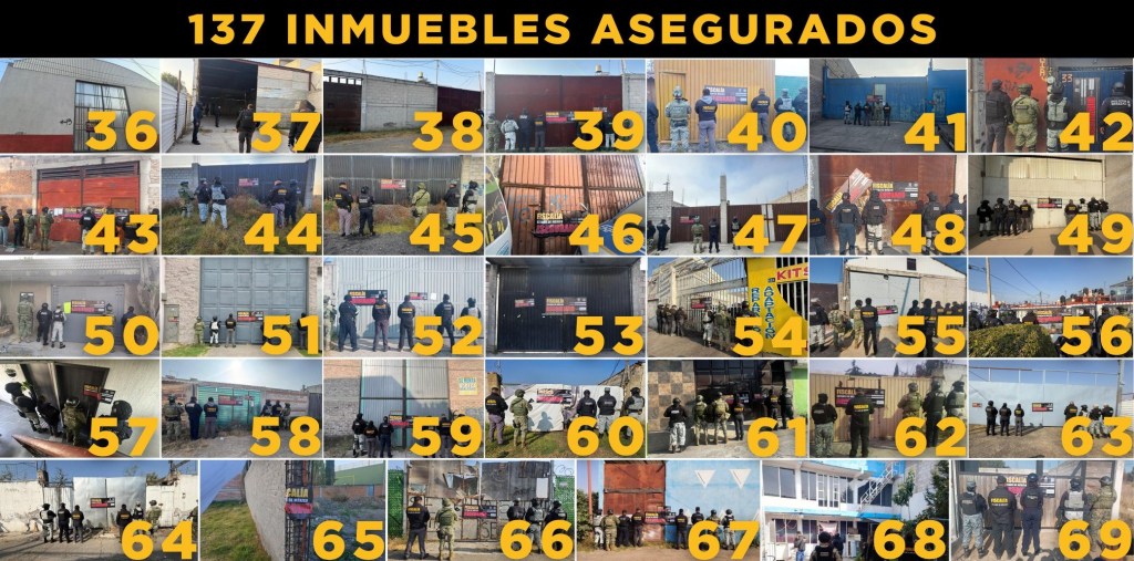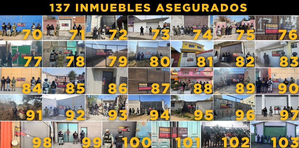 Los 137 inmuebles intervenidos son identificados como 58 bodegas, 23 encierros o pensiones, 23 casas de seguridad o domicilios de objetivos prioritarios, una empresa de monitoreo, tres deshuesaderos, dos comercios de venta irregular, cuatro restaurantes, 22 “cachimbas” y una empresa de monitoreo. La Fiscalía del Estado de México ha iniciado el procedimiento de extinción de dominio en los casos procedentes.