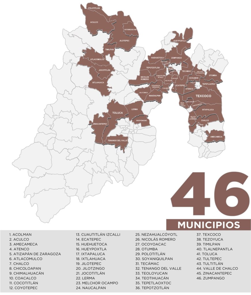 Las acciones simultáneas se desarrollaron en los municipios de Acolman, Aculco, Amecameca, Atenco, Atizapán de Zaragoza, Atlacomulco, Chalco, Chicoloapan, Chimalhuacán, Coacalco, Cocotitlán, Coyotepec, Cuautitlán Izcalli, Ecatepec, Huehuetoca, Hueypoxtla, Ixtapaluca, Ixtlahuaca, Jilotepec, Jilotzingo, Jocotitlán, Lerma, Melchor Ocampo, Naucalpan, Nezahualcóyotl, Nicolás Romero, Ocoyoacac y Otumba.