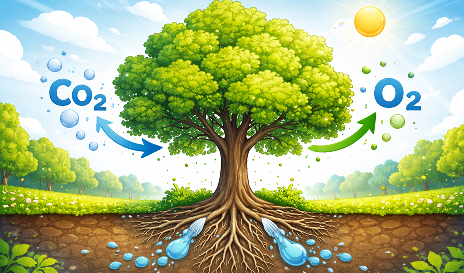 Los árboles, al igual que todas las plantas, realizan un proceso llamado fotosíntesis. Aunque el nombre suene complicado, la idea es muy sencilla. Imagina que el árbol es como una fábrica natural que funciona gracias a tres ingredientes básicos: la luz del sol, el agua y el dióxido de carbono. Las hojas capturan la luz del sol, las raíces absorben el agua del suelo y, a través de pequeños orificios en las hojas, el árbol toma el CO2 del aire. Con todo esto, el árbol fabrica su propio alimento para crecer fuerte y sano. Como resultado de este proceso, libera oxígeno al ambiente, el mismo que respiramos los humanos y los animales.