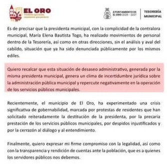El Oro, Estado de México, 15 de enero de 2026.- En un comunicado fechado el 14 de enero de 2026, el tesorero municipal de El Oro, Carlos Felipe Sánchez Florentino, denunció públicamente que la presidenta municipal, Juana Elizabeth Díaz Peñaloza, tomó el control de las cuentas bancarias del Ayuntamiento desde el pasado 19 de diciembre de 2025.